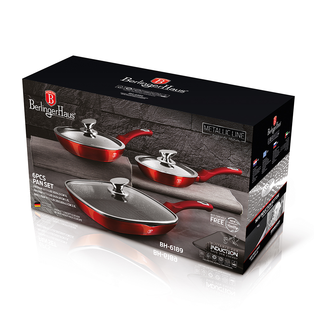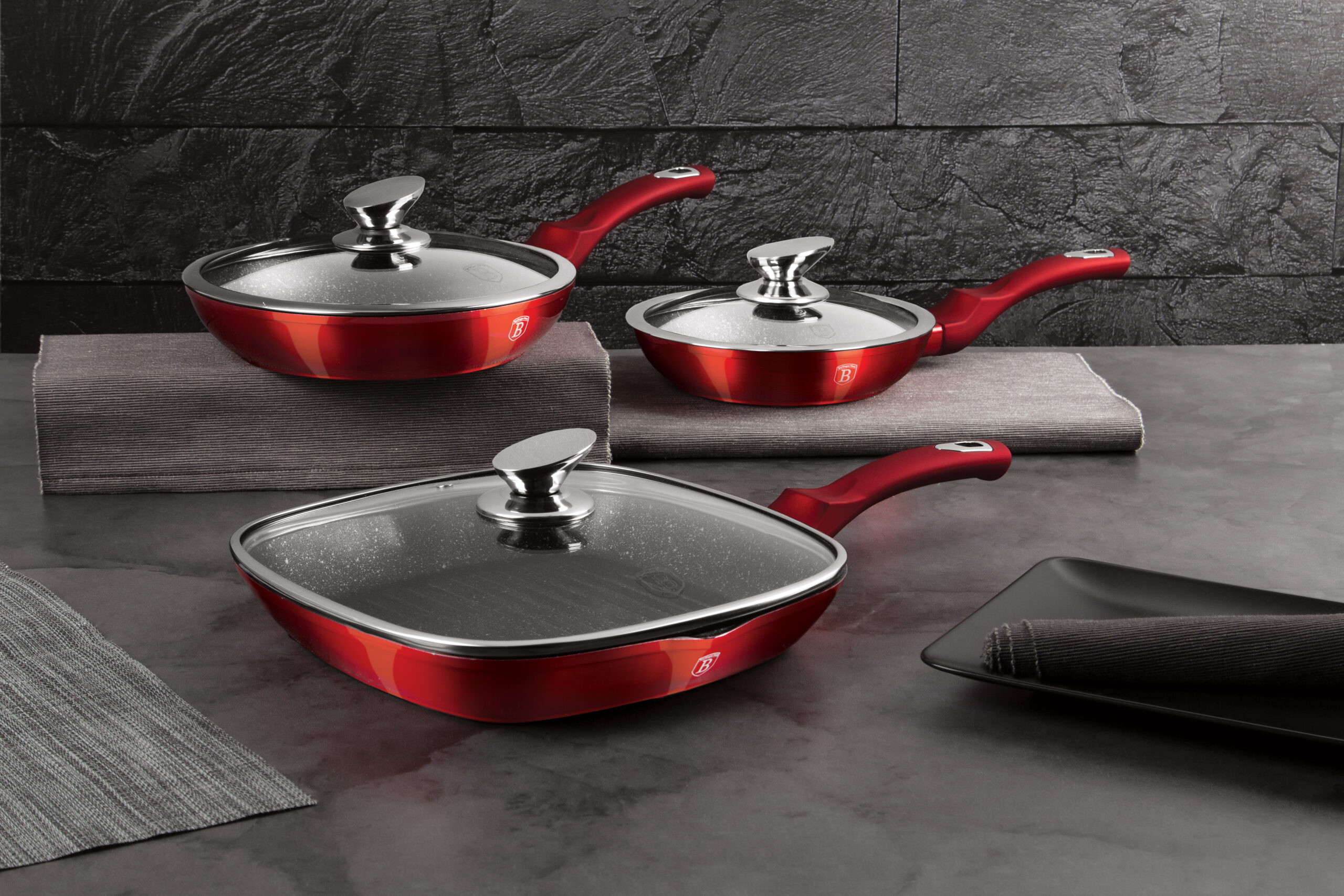 Prémium, 6 részes burgundi serpenyőszett kovácsolt alumíniumból, 3 rétegű márvány bevonattal – elegáns, energiatakarékos és könnyen tisztítható megoldás minden konyhába.