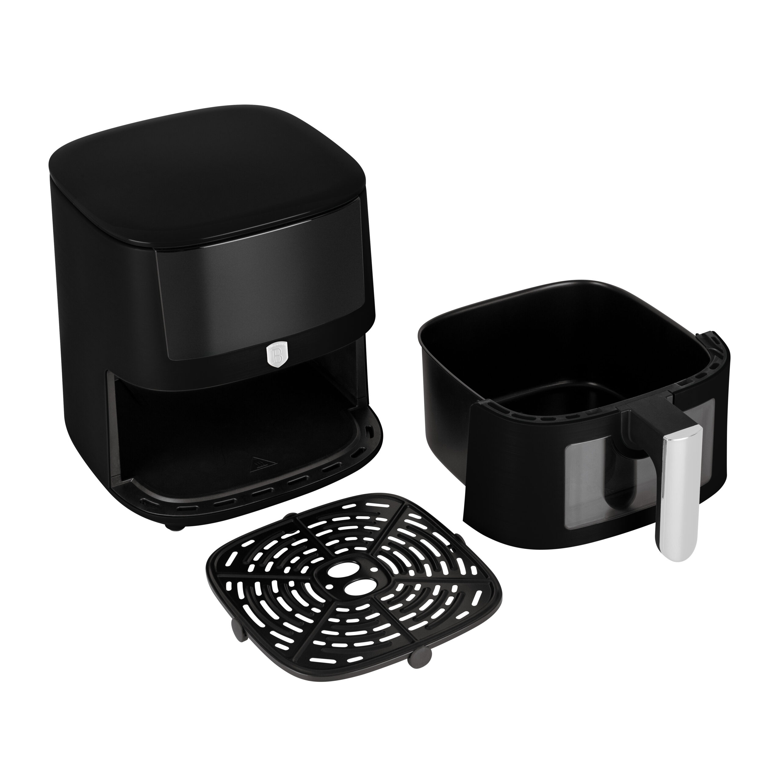 Modern, digitális forrólevegős sütő XXXL méretű 8 literes kosárral és átlátszó ablakkal – gyors, biztonságos és olajmentes főzés az egész családnak.